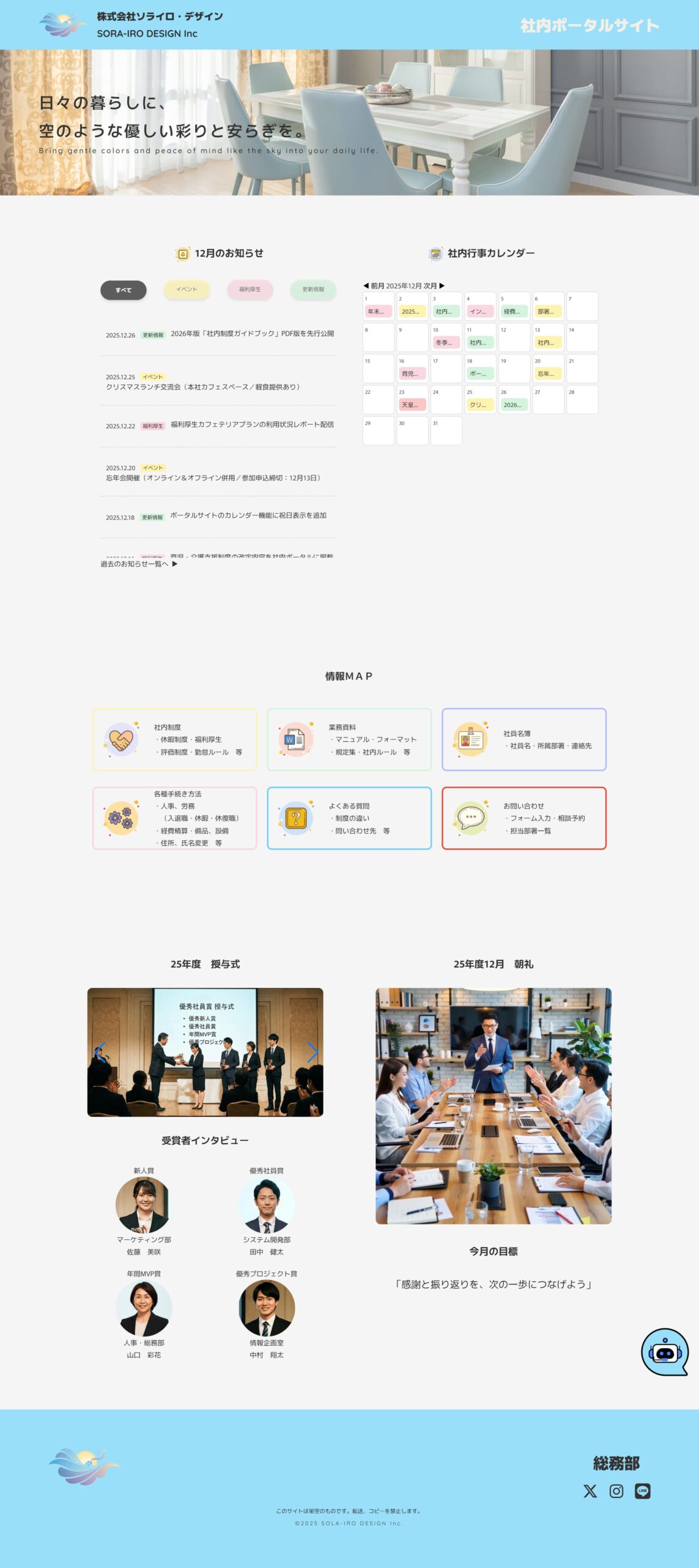 TOP:当月のお知らせ、カレンダー、情報MAP、当月のイベント、chatbot