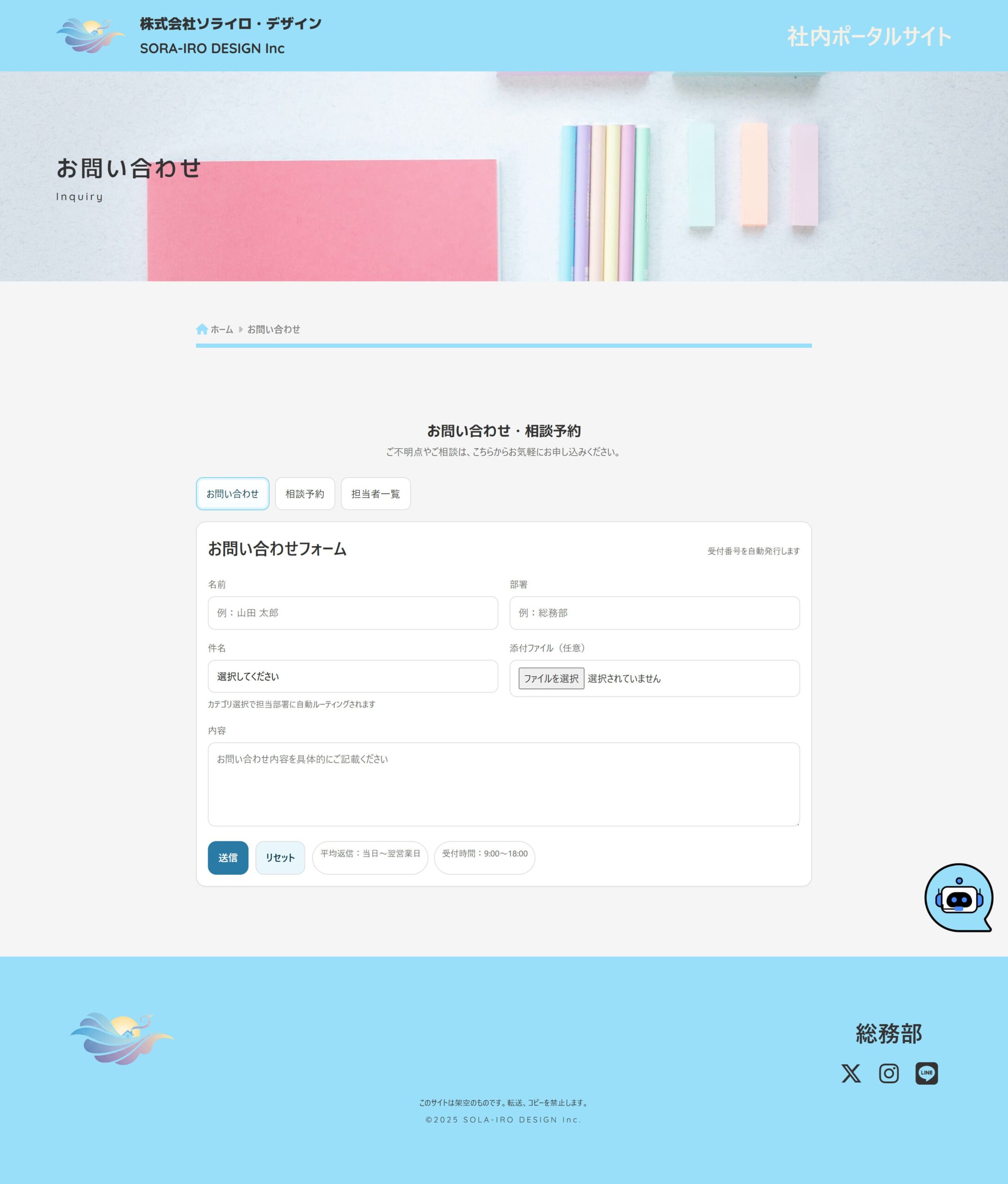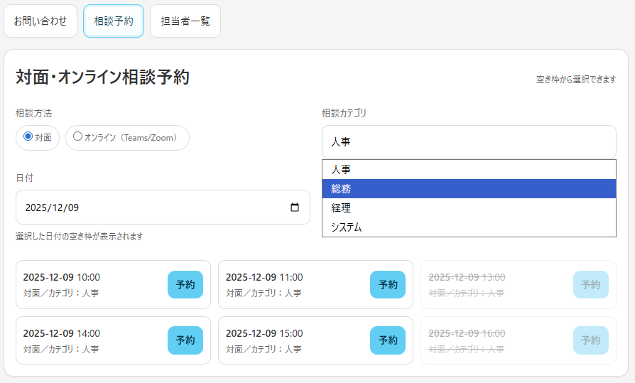 お問い合わせは通常のお問い合わせフォームと担当者との相談を対面・オンラインから選択し、予約する事が可能となっております。
