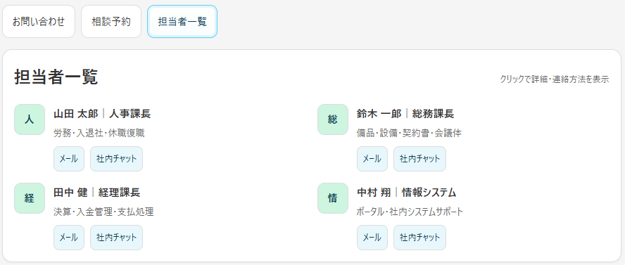 担当者一覧では、相談カテゴリーで担当する担当者と連絡先を確認する事ができます