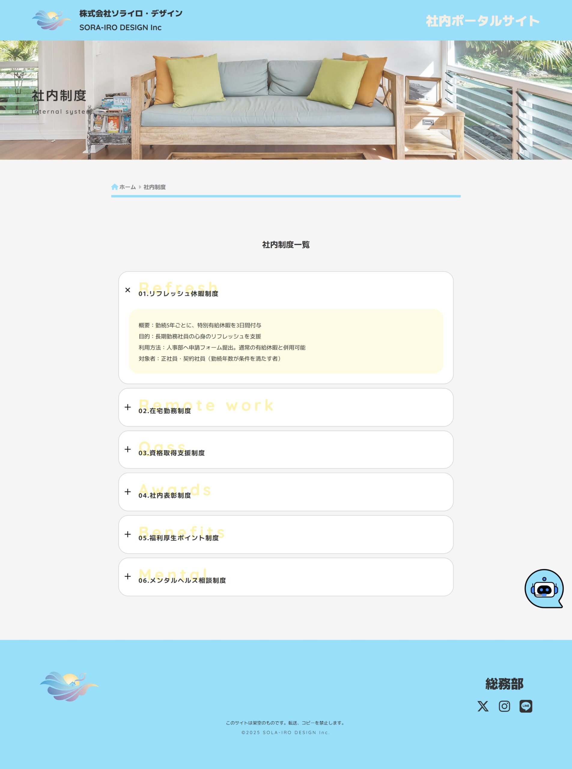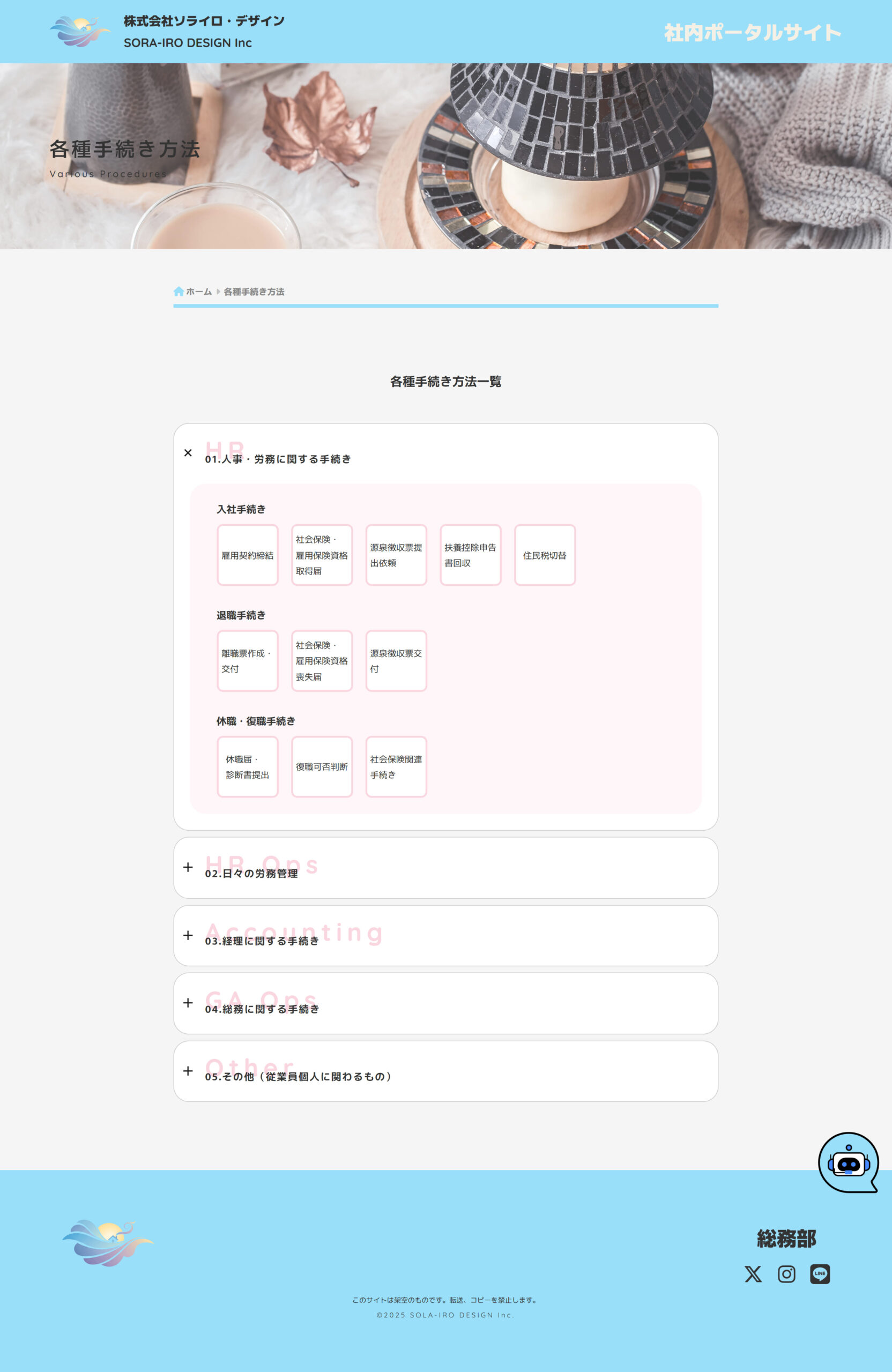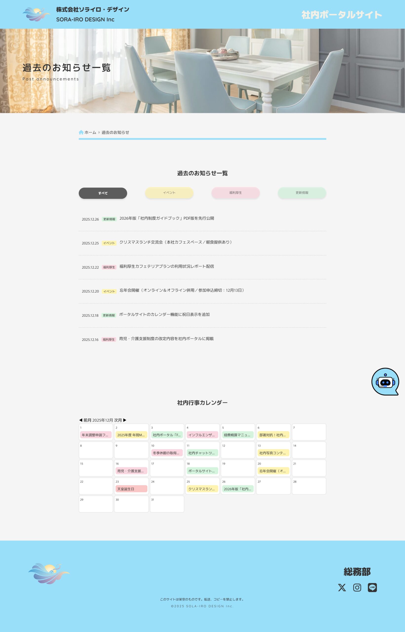下層ページ:過去のお知らせ一覧、社内制度、業務資料、社員名簿、各種手続き方法、