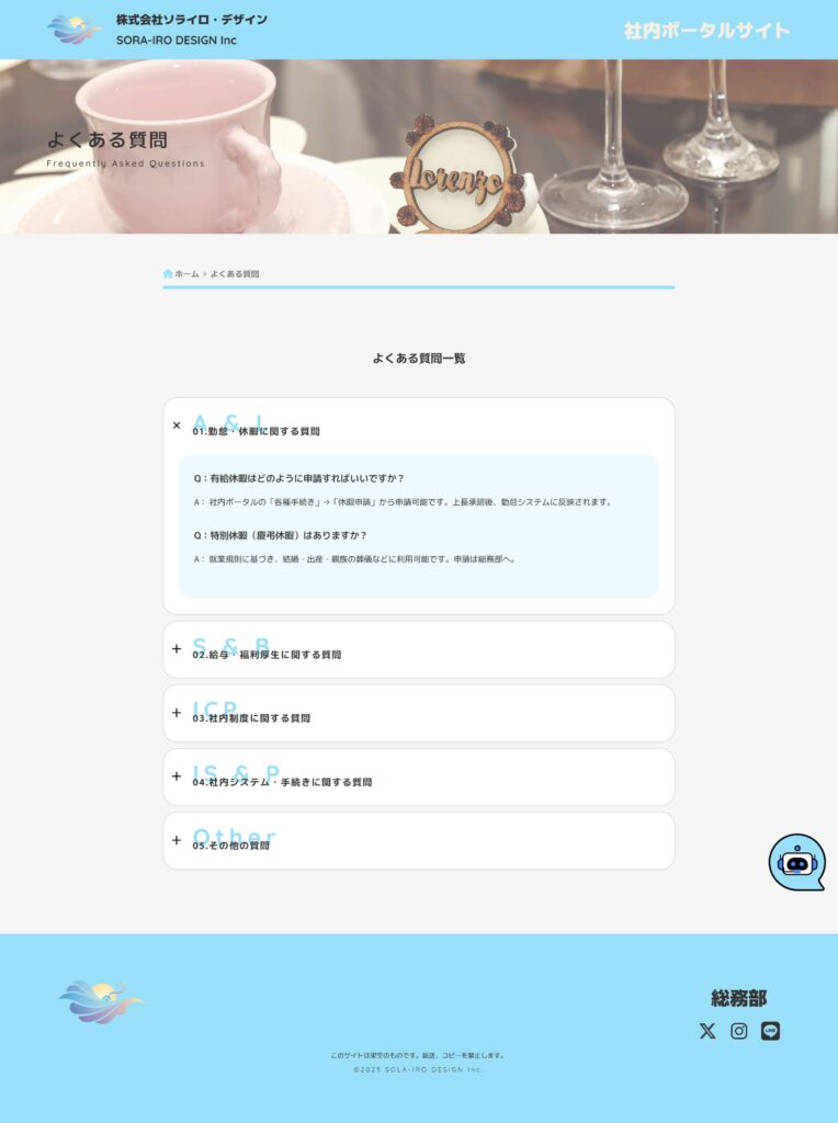 よくある質問、お問い合わせ、社内イベント(受賞式、朝礼)